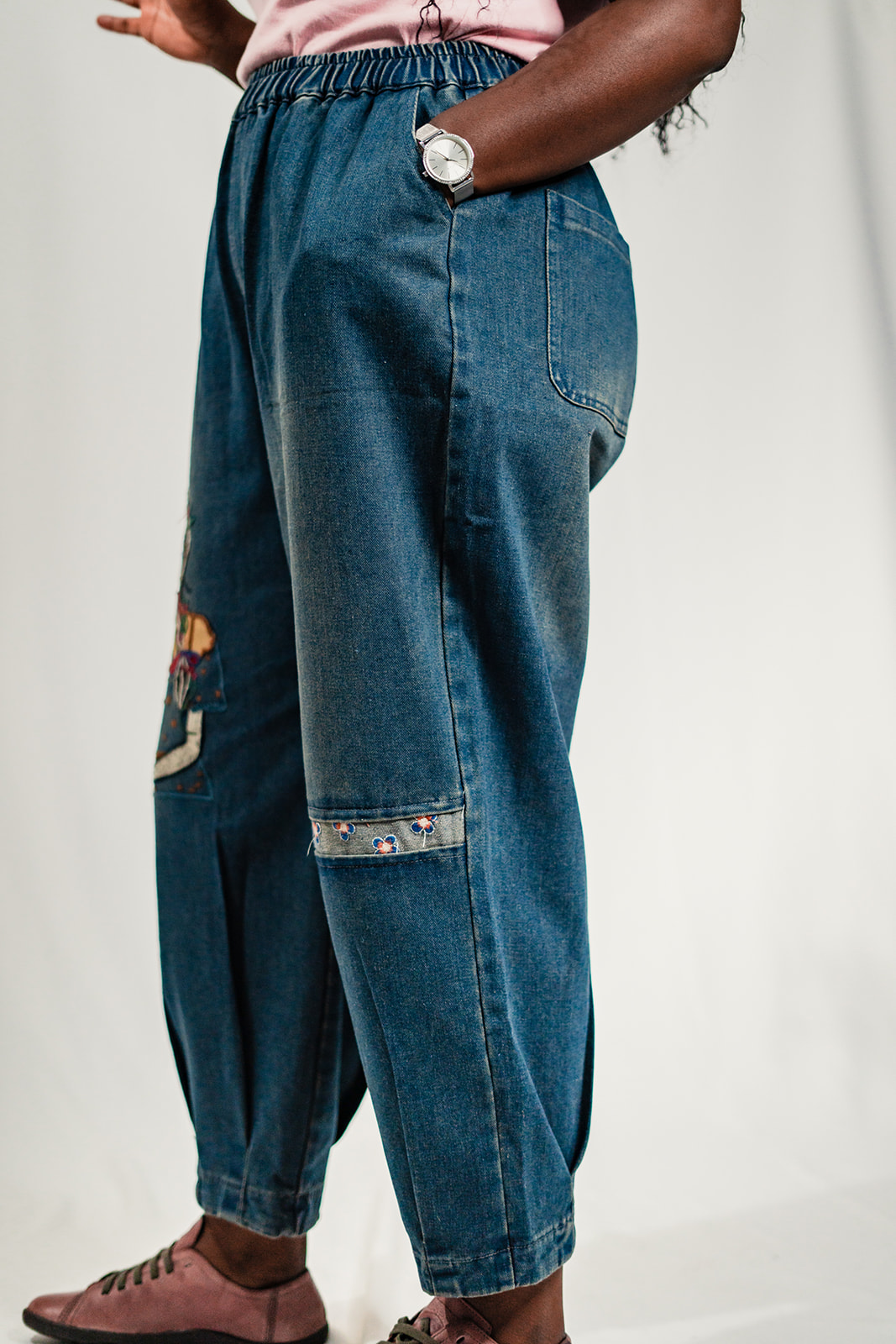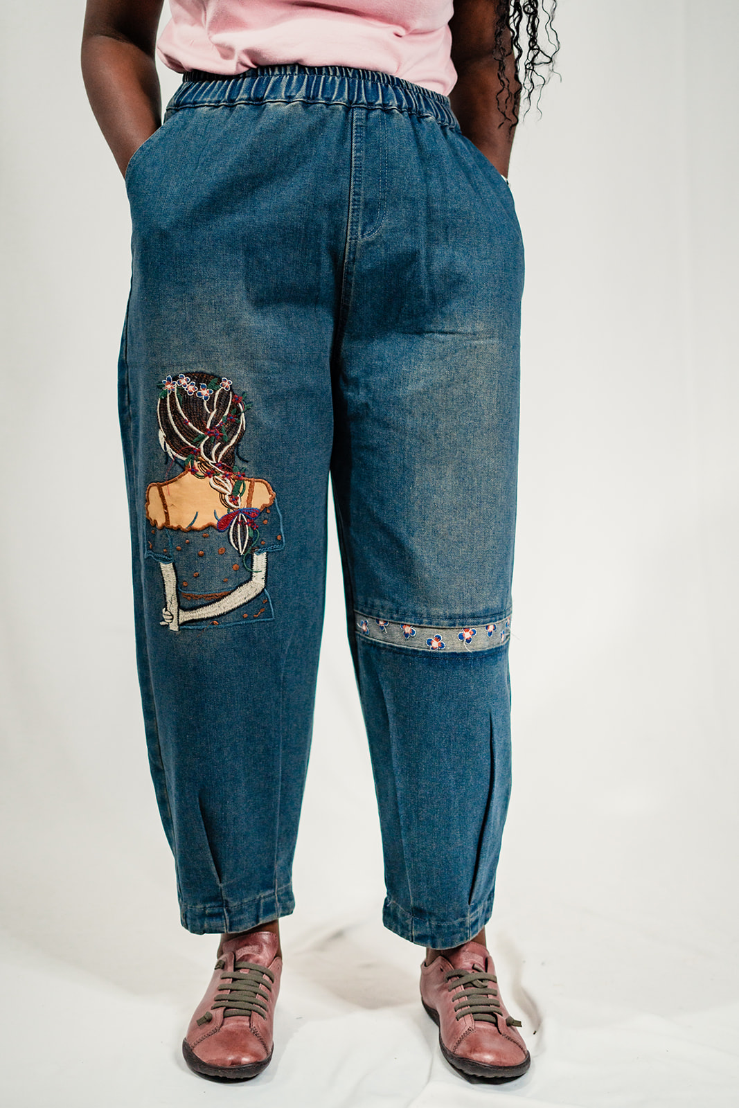 Step up your style game with our playful baggy blue jeans adorned with delightful embroidery of a girl sporting flowers in her hair. These jeans are all about expressing your unique personality and embracing a fun-loving vibe. And that’s not all! One pant leg features an eye-catching floral ribbon detail that adds a touch of whimsy. Stand out from the crowd and make a fashion statement with these trendy jeans. Perfect for pairing with your favorite tops and accessories. Get yours now and let your individuality bloom!