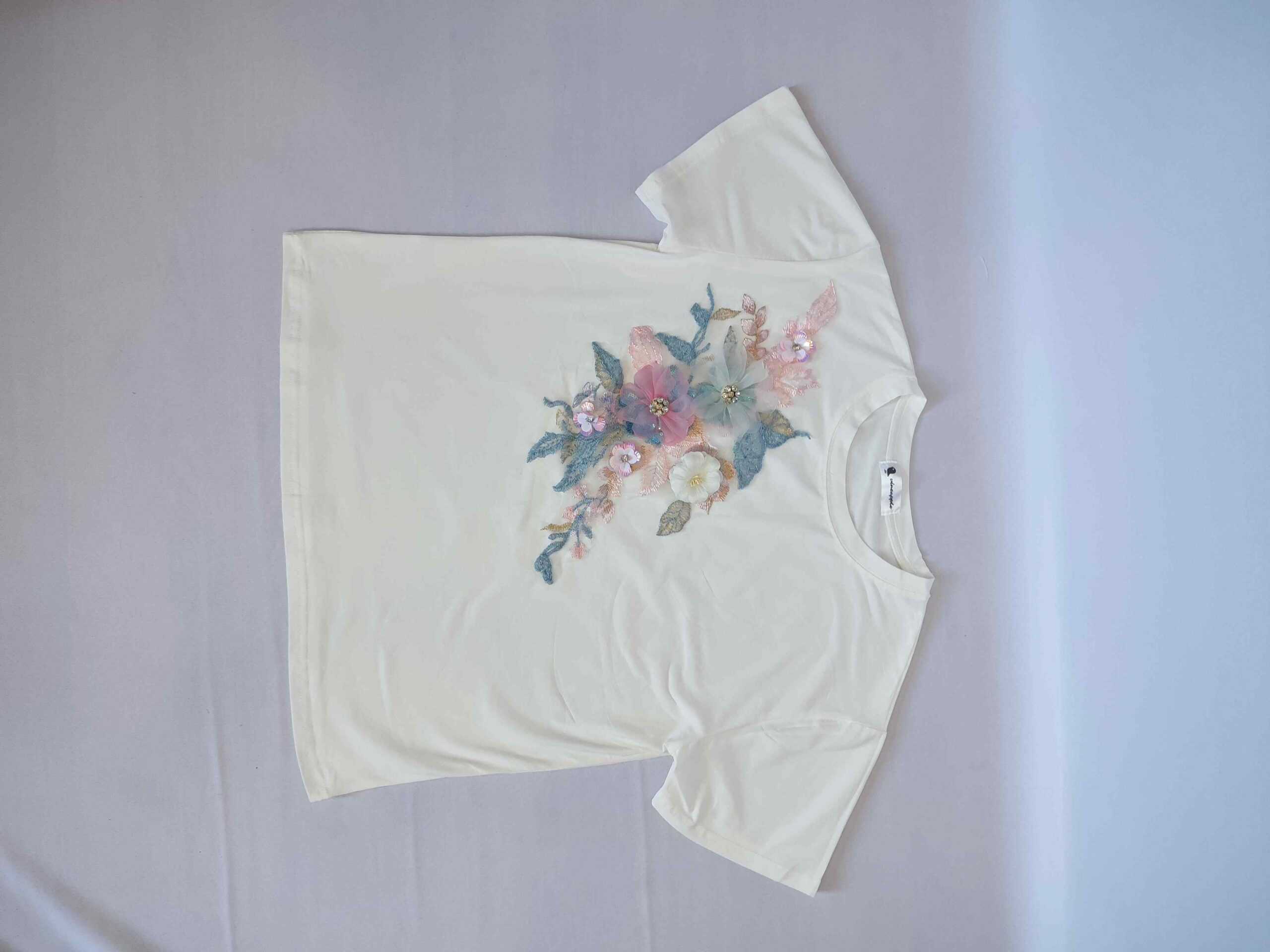 Elevate your basic white t-shirt with our charming design featuring a sewn-on flower detail. This t-shirt takes a classic staple and adds a touch of whimsy and femininity. The delicate flower embellishment adds a pop of color and texture, making it a standout piece in your wardrobe. Whether you’re going for a casual and effortless look or want to dress up a simple outfit, this t-shirt is the perfect choice. Pair it with jeans, skirts, or shorts for a versatile and stylish ensemble. Embrace the beauty of nature with our white t-shirt featuring a sewn-on flower detail. Shop now and bloom with style!